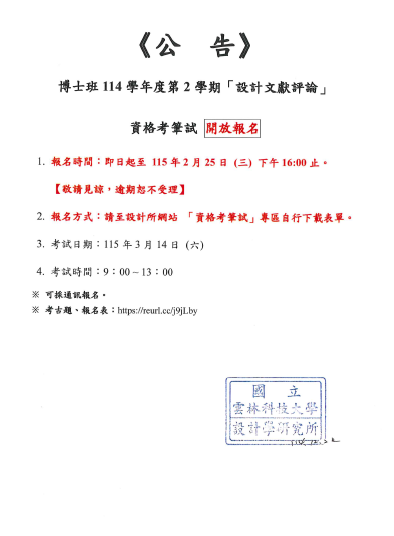 博士班114學年度第2學期 設計文獻評論 資格考筆試開放報名