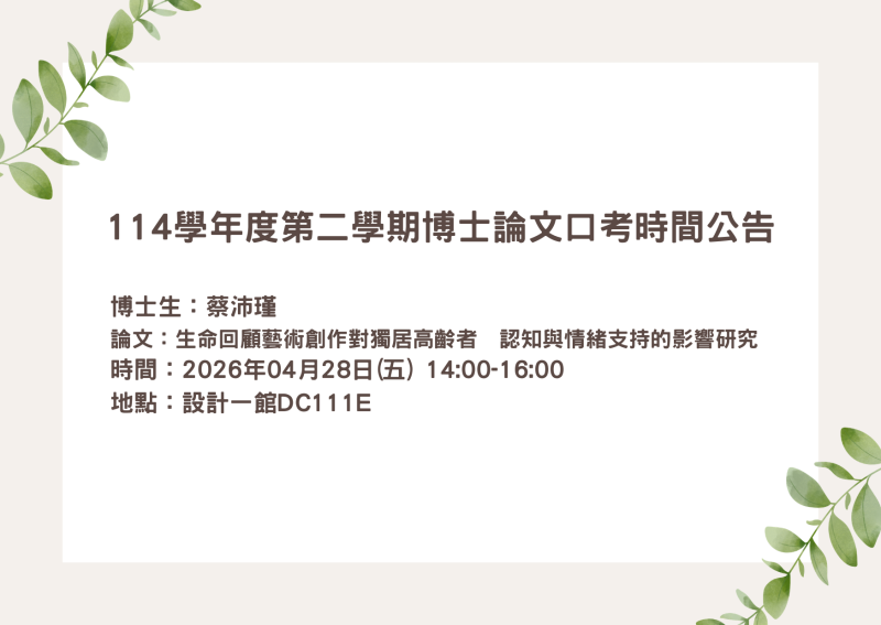 114學年度第二學期博士論文口考時間公告 歡迎旁聽
