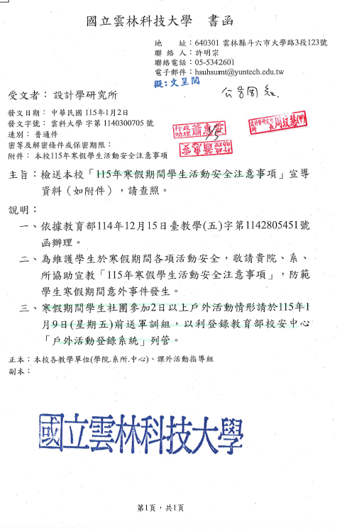 寒假期間學生社團參加2日以上戶外活動情形請於115年1月9日(星期五)前送軍訓組,